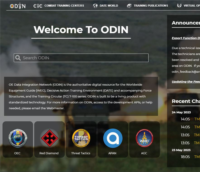 The Operational Environment Data Integration Network (ODIN) is a single resource for the Worldwide Equipment Guide (WEG), training publications, Decisive Action Training Environment (DATE), force structure information, and the Virtual OPFOR Academy (VOA).