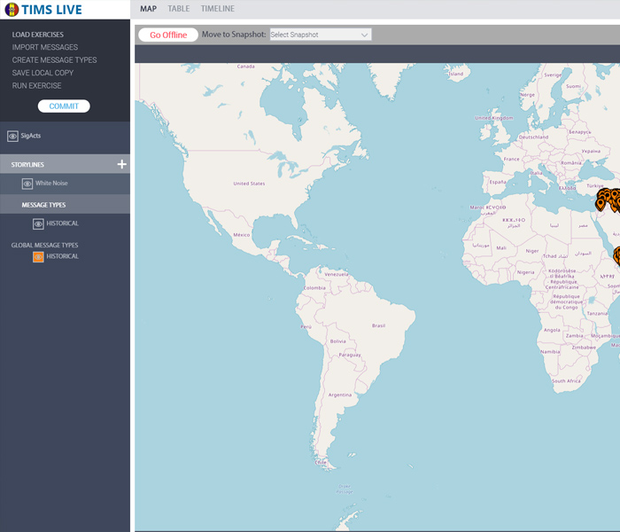 TIMS allows users to ingest large volumes of message data and geo-rectify, or “bend,” this data in time and space. Data can be reused from a previous exercise or collected from real-world messages.